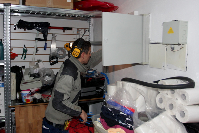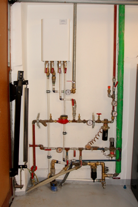 Loftpressa og gámur fjarlægð af plani. Klárað að ganga frá krönum og vatn tengt aftur. Við notuðum tækifærið og létum setja upp varmaskipti og síu við inntak. Öll áhöld HGL fjarlægð og varla nokkur merki um að nýbúið væri að vinna í húsinu í lok dags fyrir utan hreint vatn. 🙂